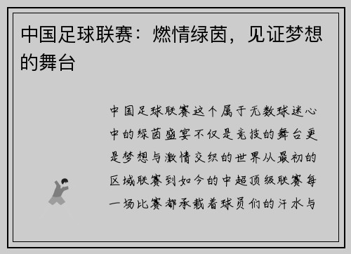 中国足球联赛:燃情绿茵,见证梦想的舞台