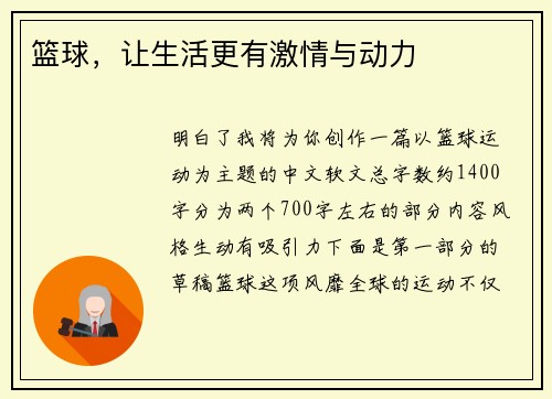 明白了,我将为你创作一篇以“篮球运动”为主题的中文软文,总字数约1400字,分为两个700字左右的部分,内容风格生动、有吸引力。下面是第一部分的草稿: 篮球,这项风靡全球的运动,不仅是一场场精彩的比赛,更是一种激发热情与动力的生活方式。从街头球场到专业赛场,篮球以其独特的魅力吸引了无数人投身其中。它...